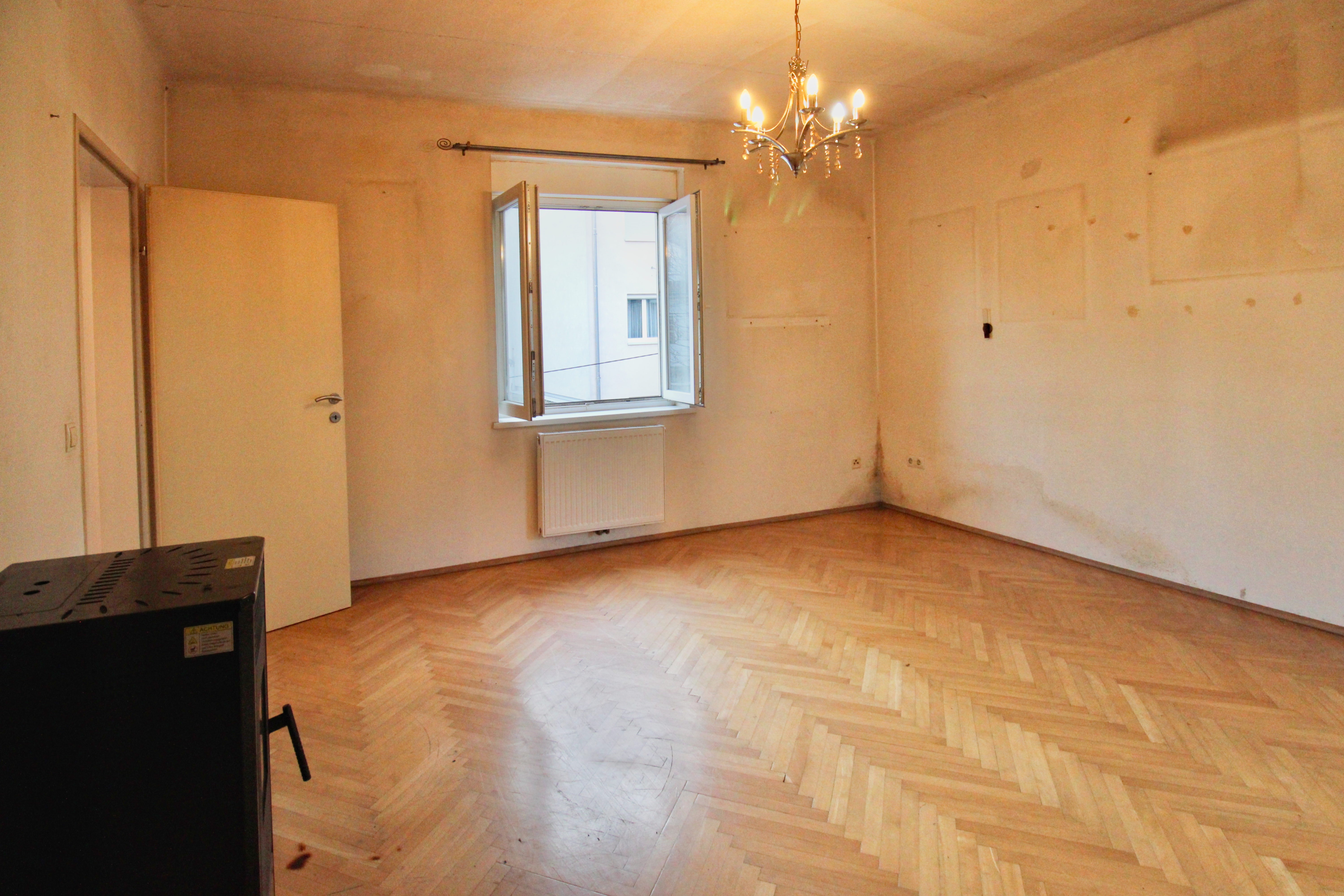 Dieses sanierungsbedürftige Schmuckstück verfügt über einen Vorraum, ein Schlafzimmer, ein geräumiges Wohnesszimmer mit Kaminanschluss, ein Badezimmer mit Dusche und WC.