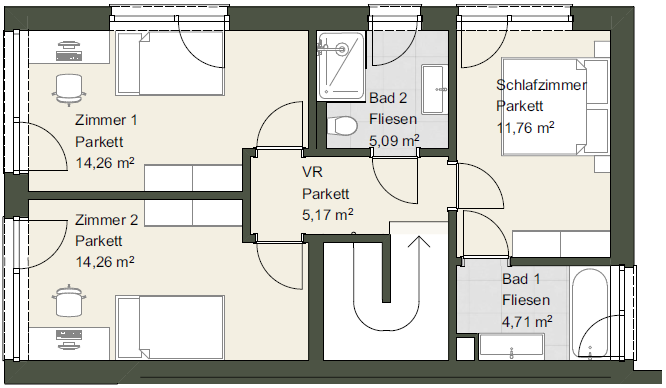 - hochwertige Ausstattung: Parkettböden, Isolierverglasung, moderner Schallschutz, Wand- und Bodenfliesen